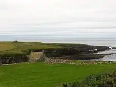 The promontory fort predated the broch, which was built inside the older structure.[5] The earlier structure was an outwork that began at the edge of the promontory in the east, a 15 feet (4.6 m) thick wall or rampart of rock with an earth core. A gateway that widened towards the outside provided access through the wall. To the west of the gateway the rampart included a structure like a cell, and then there was a recess in the inner face of the wall. The outwork continued west, ending in a fence made of flagstones that reached to the cliff edge at Chapel Geo.[6]