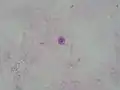 Micrograph of cryptococcosis showing the characteristically thick capsule of cryptococcus. Field stain.