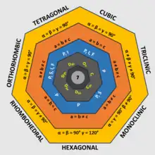 Crystal family Lattice system Volume Axial distances (edge lengths)[6]:758 Axial angles[6] Corresponding examples