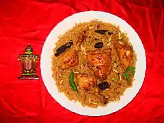 Kuwaiti cuisine is a fusion of Arabian, Iranian, and Mesopotamian cuisines. Kuwaiti cuisine is part of the Eastern Arabian cuisine. A prominent dish in Kuwaiti cuisine is machboos, a rice-based dish usually prepared with basmati rice seasoned with spices, and chicken or mutton.