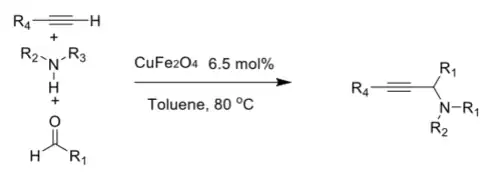Another example for MCR utilizing CuFe2O4 was published in a research towards the A3 coupling of aldehydes, amine with phenylacetylene to give the corresponding propargylamines. The catalyst can be reused three times without remarkable reduce in reaction yield.[22]