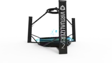 The Virtualizer enables motion by the principle of low friction. The body is fixed in a rotatable ring that can be moved vertically. In combination with a head-mounted display it allows to move, run, jump or crouch in virtual worlds. The products don't require to wear any special kind of shoes. Instead, textile overshoes are used, that are worn above regular shoes.[11] The second generation Virtualizer uses a 2 DOF (Degrees of Freedom) motion platform to actively support the walking movement of a user. For walking forwards, the platform inclines in front of the user, so that the feet glide back more easily due to the support of gravity.[12] When a user rotates or starts to walk backwards, the inclination of the platform follows these movements to continuously support gliding of the feet through gravity.[13] The company claims this motorized system would improve the gait and make walking easier.[14]