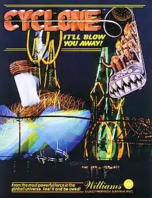 Cyclone is a pinball machine released by Williams Electronics in 1988. It features an amusement park theme, Coney Island, and was advertised with the slogan "It'll blow you away!".[1] Ronald Reagan and Nancy Reagan both appear in the backglass shown riding the rollercoaster.[2]