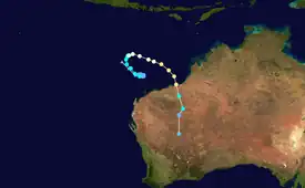 Striking a relatively isolated area, the cyclone's effects were limited, and no fatalities or injuries were reported. Indeed, a FESA official noted that initial reports of damage were "scant".[38] Preliminary assessments suggested that Pardoo Roadhouse and the small surrounding community bore the brunt of the storm, as most towns and farms in the region escaped relatively unscathed.[39] The manager of the roadhouse relayed that the height of the storm was "absolutely horrific", downing numerous trees and causing some structural damage.[37] Some destruction was also observed at the Yarrie Homestead,[1] where return to normalcy was expected to take as long as 12 months.[37] Numerous buildings on the Warrawagine Homestead sustained damage such as compromised roofs and doors, which amounted to an estimated $70,000 (2012 AUD; 74,000 2012 USD[40]). Several head of cattle were killed by the storm.[41] Moderate to major flooding took place in several areas, especially along the De Grey River drainage basin,[42] though the rainfall proved beneficial in much of the climatologically dry area.[41] The above-normal precipitation allowed farmers to get a head-start on planting winter crops.[43]
