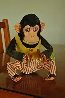 A cymbal-banging monkey toy (better known as Jolly Chimp) is a mechanical depiction of a monkey holding a cymbal in each hand.[1] When activated it repeatedly bangs its cymbals together and, in some cases, bobs its head, chatters, screeches, grins, and more. There are both traditional wind-up versions and updated battery-operated cymbal-banging monkeys. The cymbal-banging monkey toy is an example of singerie.