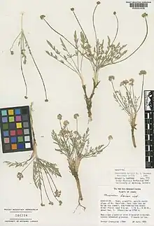 Cymopterus davisii is a species of flowering plant in the carrot family known by the common name Davis's springparsley. This small, flat, taprooted perennial is endemic to Idaho in the United States, where it occurs in the Albion Mountains.[1][2] The plant is found in the Albion Division of the Minidoka Ranger District of Sawtooth National Forest. It reaches approximately 7 in (18 cm) in height with a short stem that is sheathed by fibrous leaf bases. Numerous leaves form a whorl around yellow-flowered umbels.