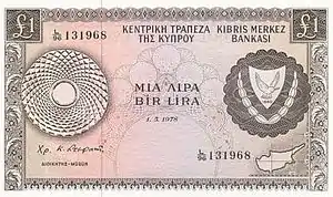 The pound, or lira (Greek: λίρα, plural λίρες, and Turkish: lira, Ottoman Turkish: لیره, from the Latin libra via the Italian lira; sign: £, sometimes £C[1] for distinction), was the currency of Cyprus, including the Sovereign Base Areas in Akrotiri and Dhekelia,[2][3] from 1879 to 2007, when the Republic of Cyprus adopted the euro. However, the self-proclaimed Turkish Republic of Northern Cyprus uses the Turkish lira as its official currency.