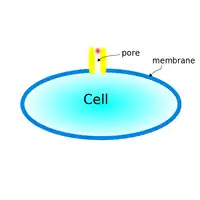 Pore forming cytolysins (PFCs) comprise near 65% of all membrane-damaging cytolysins.[8] The first pore forming cytolysin is discovered by Manfred Mayer in 1972 of the C5-C9 insertion of erythrocytes.[12] PFCs can be produced by a wide variety of sources, such as bacteria, fungi and even plants.[13] The pathogenic process of PFCs normally involves forming channels or pores at the target cells' membranes. Note that the pores can have many structures. A porin-like structure allows molecules of certain sizes to pass through. Electric fields distribute unevenly across the pore and enable the selection molecules that can get through.[14] This type of structure is shown in staphylococcal α-hemolysin.[15] A pore can also be formed through membrane fusions. Controlled by Ca2+, the membrane fusion of vesicles form water-filled pores from proteolipids.[16] Pore forming cytolysins such as perforin are used in cytotoxic killer T and NK cells to destroy infected cells.