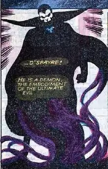 D'Spayre (sometimes D'spayre) is a fictional character appearing in American comic books published by Marvel Comics. He is a demon, and was one of the Fear Lords.[1] He has been opposed by Spider-Man, Scarlet Spider, Man-Thing, Cyclops, Hulk, Juggernaut, Doctor Strange, Cloak & Dagger, and the New Avengers.
