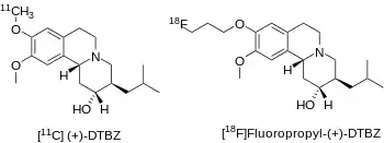 Carbon-11 labeled (+)DTBZ(right) and fluorine-18 labeled fluoropropylated (+)DTBZ(left)