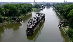 The Dan Patch Line Bridge is a railroad swing bridge that carries the Canadian Pacific Railway's MN&S Subdivision across the Minnesota River in the U.S. state of Minnesota. The MN&S Subdivision originated as the Minneapolis, St. Paul, Rochester and Dubuque Electric Traction Company, more commonly known as the Dan Patch Lines. Today's name for the rail line comes from the Minneapolis, Northfield and Southern Railroad, which took over the Dan Patch route after the original railroad fell into bankruptcy. Despite being met by Canadian Pacific rails at either end, the bridge itself is owned by the Twin Cities and Western Railroad which has trackage rights on the CP line to the north. The TC&W purchased the bridge in order to protect a route that may become important in the future.[2]