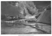 George served on board U.S. Picket Boat No. 1, in action near Plymouth, North Carolina, 27 October 1864, against the Confederate ram, Albemarle, which had resisted repeated attacks by our steamers and had kept a large force of vessels employed in watching her. The picket boat, equipped with a spar torpedo, succeeded in passing the enemy pickets within 20 yards without being discovered and then made for the Albemarle under a full head of steam. Immediately taken under fire by the ram, the small boat plunged on, jumped the log boom which encircled the target and exploded its torpedo under the port bow of the ram. The picket boat was destroyed by enemy fire and almost the entire crew taken prisoner or lost.[3]
