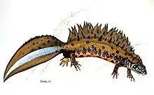 The Danube crested newt or Danube newt (Triturus dobrogicus) is a species of newt found in central and eastern Europe, along the basin of the Danube river and some of its tributaries and in the Dnieper delta. It has a smaller and more slender body than the other crested newts in genus Triturus but like these, males develop a conspicuous jagged seam on back and tail during breeding season.