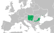 In addition to the northern crested newt to the north, the Danube crested newt's range borders that of the Italian crested newt (T. carnifex) in the west, and that of the Macedonian (T. macedonicus) and Balkan (T. ivanbureschi) crested newts in the south.[10]:16–17