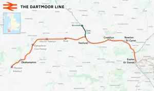 The Dartmoor line is a 15+1⁄2-mile (24.9 km) railway line in Devon, England. From Crediton, the line runs alongside the Tarka Line to the site of the former Coleford Junction where it diverges west to Okehampton. Previously a heritage line, it is owned by Network Rail.[1]