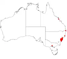 • Darwinia fascicularis subsp. fascicularis[12] (the autonym) is an erect shrub to 2 m (6.6 ft) high and has flowers of 4-20 in a tight cluster. The branches do not take root when in contact with the soil. It grows from Gosford in the Central Coast to Bulli near Wollongong within 30 km (19 mi) of the coast. Grows in exposed situations on the edge of sandstone ridges, mostly in heathland or dry sclerophyll scrub below 500 m (1,600 ft).[7][9][11]