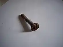 Date nails were tagging devices utilized by railroads and utility companies to visually identify the age of railroad ties or utility poles. Octave Chanute, railroad and aviation pioneer, is credited with the idea for using date nails as a way of tracking the life of railroad ties.[1] Different railroads used different sized nails with either alpha or numerical markings. An example would be a Southern Pacific Railroad nail with the marking "01" stamped on the head of the nail. The "01" would identify the nail as being hammered into a railroad tie in the year 1901.[2]