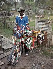 The 1960s brought both social and personal turmoil to Butler's life. Desegregation and the civil rights movement made life in southern Louisiana increasingly difficult for African American communities. In 1962, Butler was forced into retirement on disability due to a head injury that he sustained at the box factory.[1][6][8] In 1968 his wife Elnora died. Coupled with his retirement, this left him feeling "chronically nervous."[6][8] After his retirement, Butler began to adorn his home and yard by turning used tin into flowers for his garden,[7] window coverings (which he called "spirit shields"[8]), and "whirligigs" that moved according to the winds. He was famous for riding, as his only transportation, a bicycle meticulously decorated with found and created objects that spun and moved as the wheels turned. Butler saw his daily five-mile ride as one that enabled him to share his work with others.[7]