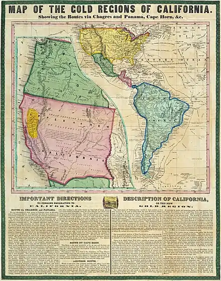 On January 24, 1848, James W. Marshall and his crew found gold at Sutter's Mill in Coloma, California. This discovery would lure tens of thousands of people from the United States and foreign nations. People packed their belongings and began to travel by covered wagon to what they hoped would be new and better life. Since the first great influx of these pioneers began in 1849, they are generally referred to as 49ers.[1] However, the Donner Party pioneers had provided a sobering lesson after mis-scheduling the overland trip to California in 1846–47. Those pioneers had started late and elected to follow the Hastings Cutoff, a new route which slowed the group, and they reached the Sierra Nevada late in fall 1846. There, a storm trapped them in the mountains, resulting in the infamous disaster.[2]:60–61