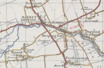 St. Peter's, Maxey, the most northerly ecclesiastical parish in the Diocese of Peterborough, includes Deeping Gate. For local government purposes it forms part of Northborough ward, within North West Cambridgeshire parliamentary constituency. Deeping Gate falls within the drainage area of the Welland and Deepings Internal Drainage Board.[3]