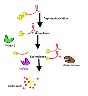 The RNA's destruction process is very complicated. To make it easier to understand, we use as an example the mRNA degradation procedure in Escherichia coli because it is the best known process. It is mediated mainly by endo- and ribo- nucleases. The enzymes RNase II and PNPase (polynucleotide phosphorylase) degrade mRNA in a 3'→5' way. The degradosome has 4 compartments that have several ribonucleases. Initially, the synthesized RNA is a polyphosphate structure. This is why the dephosphorylation is needed, in order to obtain monophosphate by the action of a RNA pyrophosphohydrolase PppH. The transcripts have two parts: the phosphate terminal (P-terminal) and a stem-loop structure as an end. The P-terminal is endoribonucleolytically cleavaged by RNase E, while the stem-loop is digested by RNA helicases. If there are any secondary structures, the performance of polymerase PAP is needed to simplify the reduction by exoribonucleases such as PNPase. Finally, the scraps are processed by oligoribonucleases.