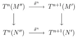 The second property expresses the functoriality of a δ-functor. The modifier "cohomological" indicates that the δn raise the index on the T. A covariant homological δ-functor between A and B is similarly defined (and generally uses subscripts), but with δn a morphism Tn(M '') → Tn-1(M'). The notions of contravariant cohomological δ-functor between A and B and contravariant homological δ-functor between A and B can also be defined by "reversing the arrows" accordingly.