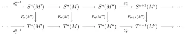 A morphism of δ-functors is a family of natural transformations that, for each short exact sequence, commute with the morphisms δ. For example, in the case of two covariant cohomological δ-functors denoted S and T, a morphism from S to T is a family Fn : Sn → Tn of natural transformations such that for every short exact sequence