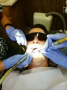 ![]() A dentist (seated) treating a patient with the help of an assistant (standing). | |