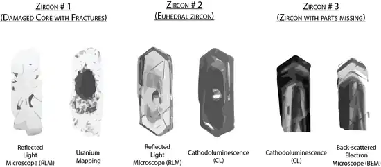 Qualitative approach examines all the available detrital zircons individually regardless of their abundance among all grains.[13][14] This approach is usually conducted with high precision thermal ionization mass spectrometry (TIMS) and sometimes secondary ion mass spectrometry (SIMS).[3] Optical examination and classification of detrital zircon grains are commonly included in qualitative studies through back-scatter electrons (BSE) or cathodoluminescence (CL) imagery,[3] despite the relationship between the age and optical classification of detrital zircon grains is not always reliable.[15]