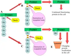 - ↑ Wilkinson KD (December 1997). "Regulation of ubiquitin-dependent processes by deubiquitinating enzymes". FASEB Journal. 11 (14): 1245–56. doi:10.1096/fasebj.11.14.9409543. PMID 9409543. S2CID 11788220.