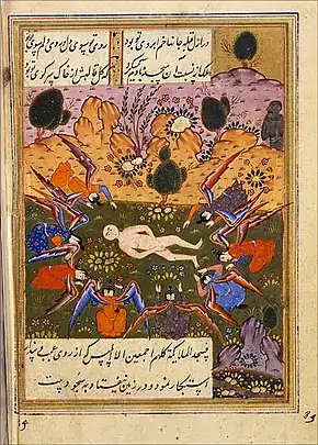 Iblis (top right on the picture) refuses to prostrate before the newly created Adam from a Persian miniature.