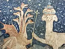 Satan (the dragon; on the left) gives to the beast of the sea (on the right) power represented by a sceptre in a detail of panel III.40 of the medieval French Apocalypse Tapestry, produced between 1377 and 1382.
