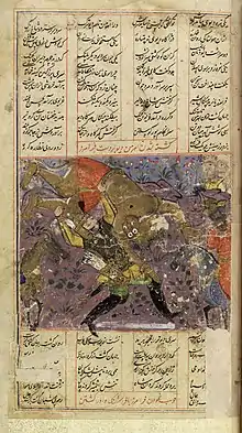 Zoroastrianism probably introduced the first idea of the devil; a principle of evil independently existing apart from God.[91] In Zoroastrianism, good and evil derive from two ultimately opposed forces.[92] The force of good is called Ahura Mazda and the "destructive spirit" in the Avestan language is called Angra Mainyu. The Middle Persian equivalent is Ahriman. They are in eternal struggle and neither is all-powerful, especially Angra Mainyu is limited to space and time: in the end of time, he will be finally defeated. While Ahura Mazda creates what is good, Angra Mainyu is responsible for every evil and suffering in the world, such as toads and scorpions.[91] Iranian Zoroastrians also considered the Daeva as devil creature, because of this in the Shahnameh, it is mentioned as both Ahriman Div (Persian: اهریمن دیو, romanized: Ahriman Div) as a devil.