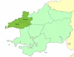 Dewisland was almost identical in area to the pre-Norman cantref of Pebidiog,[4] one of the traditional seven cantrefs of Dyfed. It was said to be divided into two commotes: Mynyw (Latin: Menevia) and Pencaer.[5] In the later centuries of the first millennium, Dyfed (including Pebidiog) was subsumed into Deheubarth.