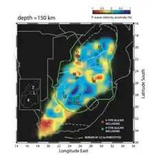 In the cratonic crust of the Kaapvaal-Zimbabwe craton, Southern Africa, seismic velocity at 150-km depth correlates with the nature of diamond inclusions, whether peridotitic or eclogitic. This suggests that lithospheric P-wave speeds can be used, perhaps elsewhere as well as in souther Africa, to map the distribution of different diamond source regions.[9]