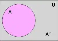 In this image, the universal set U (the entire rectangle) is dichotomized into the two sets A (in pink) and its complement Ac (in grey).