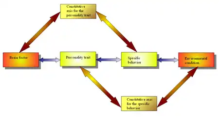 In addition to this "doing" dimension of personality, there is also a "being made" dimension, including the constitutive axes – each one formed of a mental content (which can be cognitive, verbal, motivational, or pragmatic, depending on the personality aspect), a mental and behavioral activity related to it (which can be cognitive, practical, affective, expressive, regulative, or adaptive), and their brain and environmental correlates, respectively.[46] Each constitutive axis consists of two couples: one formed by a brain factor and the corresponding behavior, shaping a mental (memory) content and structuring a "trait" or recurrent behavior, and the other one formed by that mental content and its environmental correlate, generating the specific behavior (functioning).[46] For example, assertive behavior is determined by environmental factors and assertiveness, whereas assertiveness itself is the product of both brain predisposition and assertive behavior. An obsessive-compulsive individual maintains his obsessions (content) if often left alone with his predisposing brain and ritualistic behaviors. A shy person (trait) displays less shy behavior when in a familiar environment. This model provides a picture of the emergent relations between personality structuring, mental functioning (behavior), environment, and biology.[47]