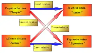In every specific task of daily life, one of the first four dimensions (cognitive, practical, affective, or expressive) is dominant, being at the center of the experience, whereas the other three are subordinated to it. Regulative and adaptive dimensions are constantly acting as a background throughout the behavioral process.[43]