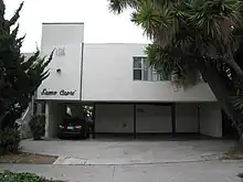 A dingbat is a type of apartment building that flourished in the Sun Belt region of the United States in the 1950s and 1960s, a vernacular variation of shoebox style "stucco boxes". Dingbats are boxy, two or three-story apartment houses with overhangs sheltering street-front parking.[1] They remain widely in use today as “bastions of affordable shelter.”[2]