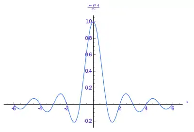 The sinc function, showing the time domain artifacts (undershoot and ringing) of truncating a Fourier series.