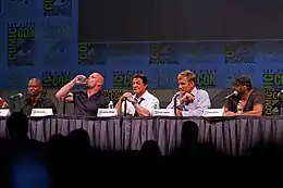 In 2010, Lundgren made a guest star appearance on the TV series Chuck in the fourth-season premiere episode, "Chuck Versus the Anniversary", as Russian spy Marco, with references to Rocky IV's Ivan Drago.[116] He then played a drug-addled assassin in the ensemble action film The Expendables, in a cast which includes popular action stars such as Stallone, Jason Statham, Jet Li and Randy Couture as an group of elite mercenaries, tasked with a mission to overthrow a Latin American dictator. It was described by Lundgren as "an old-school, kick-ass action movie where people are fighting with knives and shooting at each other."[117] The film received mixed reviews from critics but was very successful commercially, opening at number one at the box office in the United States, the United Kingdom,[118] China[119] and India.[120]