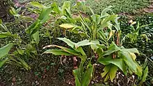 The giant taro (Alocasia macrorrhizos) was originally domesticated in the Philippines, but are known from wild specimens to early Austronesians in Taiwan. From the Philippines, they spread outwards to the rest of Island Southeast Asia and eastward to Oceania where it became one of the staple crops of Pacific Islanders.[18][19] They are one of the four main species of aroids (taros) cultivated by Austronesians primarily as a source of starch, the others being Amorphophallus paeoniifolius, Colocasia esculenta, and Cyrtosperma merkusii, each with multiple cultivated varieties. Their leaves and stems are also edible if cooked thoroughly, though this is rarely done for giant taro as it contains higher amounts of raphides which cause itching.[20][21]
