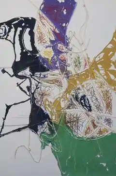 Dona Nelson (born 1947) is an American painter, best known for immersive, gestural, primarily abstract works employing unorthodox materials, processes and formats to disrupt conventional notions of painting and viewership.[1][2] A 2014 New Yorker review observed, "Nelson gives notice that she will do anything, short of burning down her house to bully painting into freshly spluttering eloquence."[3] Since 2002, long before it became a more common practice,[4][5] Nelson has produced free-standing, double-sided paintings that create a more complex, conscious viewing experience.[6][7] According to New York Times critic Roberta Smith, Nelson has dodged the burden of a "superficially consistent style," sustained by "an adventuresome emphasis on materials" and an athletic approach to process that builds on the work of Jackson Pollock.[2] Writers in Art in America and Artforum credit her experimentation with influencing a younger generation of painters exploring unconventional techniques with renewed interest.[8][9] Discussing one of Nelson's visceral, process-driven works, curator Klaus Kertess wrote, the paint-soaked "muslin is at once the tool, the medium, and the made."[1]