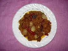 Dopiaza (Persian: دوپیازه, meaning "two onions") is the name of two separate dishes, one in the Greater Iran region and one in South Asia. It refers to a family of recipes, typically meat-based, that contain onions as a major ingredient. There are two alternative etymological explanations for its name.