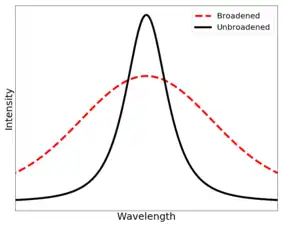 In atomic physics, Doppler broadening is broadening of spectral lines due to the Doppler effect caused by a distribution of velocities of atoms or molecules. Different velocities of the emitting (or absorbing) particles result in different Doppler shifts, the cumulative effect of which is the emission (absorption) line broadening.[1] This resulting line profile is known as a Doppler profile. A particular case is the thermal Doppler broadening due to the thermal motion of the particles. Then, the broadening depends only on the frequency of the spectral line, the mass of the emitting particles, and their temperature, and therefore can be used for inferring the temperature of an emitting (or absorbing) body being spectroscopically investigated.