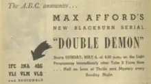 Double Demon is a 1951 Australian radio serial by Max Afford featuriing his detective hero, Jeffrey Blackburn. He wrote it after returning to Australia following a long trip to England, whereupon he signed a long-term contract with the ABC. This serial was one of the first results of that new arrangement..[3]