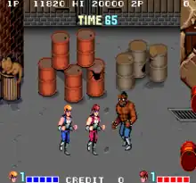 The player takes control of martial artist Billy Lee, or his twin brother Jimmy (also known as Hammer and Spike in the supplementary materials for the American arcade release), as they fight their way into the turf of the Black Warriors gang in order to rescue Billy's girlfriend, Marian. The player character has a repertoire of martial arts techniques which they can perform by using the joystick and three action buttons (kick, jump, and punch) individually or in combination. Techniques range from basic punches and kicks to more elaborate attacks such as throws and elbow strikes. When playing with another player, one can grab an opponent from behind, allowing the other to attack unimpeded; some enemies are able to do the same thing to the players. The player begins the game with a certain number of extra lives and a life gauge which depletes as the player takes hits, and must complete each stage within a time limit. One life is lost if either the life gauge or timer reaches zero, or if the player character falls off the bottom of the screen or into a hole, river, or bed of spikes.