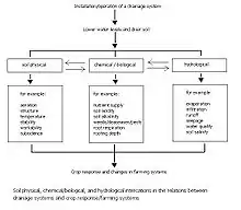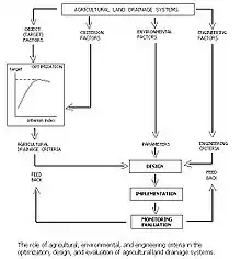 1. A drainage system influences this depth; the relation between drainage system design and depth of water table is mainly physical and can be described by drainage equations, in which the drainage requirements are to be found from a water balance.[1]