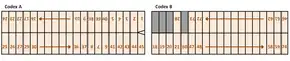 Today's page numbers were assigned to the codex by Agostino Aglio when he became the first to transcribe the manuscript in 1825/26. For this, he divided the original codex into two parts, labeled Codex A and Codex B. He sequenced Codex A on the front side followed by its back side, with the same order on Codex B. Today, historians such as Helmut Deckert and Ferdinand Anders understand that a codex reading should traverse the complete front side followed by the complete back side of the manuscript, i.e., pages 1–24 followed by 46-74 and 25-45.[45] The librarian K. C. Falkenstein adjusted the relative position of pages for “esthetical reasons” in 1836, resulting in today's two similar length parts.[46] While deciphering the codex, the librarian E. W. Förstemann noticed an error in Aglio's page assignment of the sheets 1/45 and 2/44, so he correctly reassigned Aglio's pages 44 and 45 to become pages 1 and 2.[47] The reversal of the sheets 6/40, 7/39 and 8/38 is due to an error when the sheets were returned to their protective glass cabinet after drying from the water damage due to the bombing of Dresden in 1945.[48]