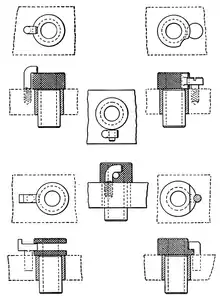 Renewable bushings must be secured in their liner bushing, otherwise the tool can cause it to spin, which rapidly wears out the liner, or chips can force the bushing out of the liner. There are many different types of locking systems for renewable bushings. One system is a dog, which is a collar that is pressed over the head of the bushing and has a long tail. The tail may be bent at the end so it can lock around the edge of the jig plate or it may be left straight if it can butt up against another object. Another option to keep the renewable bushing from rotating is to pin it, either by putting a pin in the renewable bushing and a hole in the liner or vice versa. A more complicated version uses a hole in the bushing collar and a pin with a head; the head on the pin holds the edge of the collar down, but for removal the bushing can be rotated so that the hole lines up with the pin.[5]